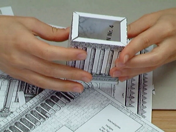 Wenn Sie auf dieses Foto klicken, zeigt ein Video, wie man so einen Bogen ausschneidet, falzt und zusammenklebt: