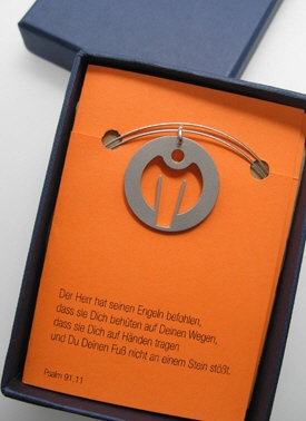 Engel-Anhänger rund aus mattiertem Edelstahl mit dazu passendem Edelstahlseil-Collier (42 cm lang) in modernem Design. - Als Geschenk mit einer guten Botschaft zu Weihnachten, Geburtstagen oder zur Konfirmation geeignet. Zurückhaltend und doch ansprechend von dem Hamburger Künstler Andreas Kasparek gestaltet.
