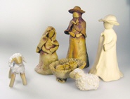7 handgefertigte Keramikfiguren aus heimischer Produktion: Maria, Josef, Kind mit Kroppe, Schäfer, 2 Schafe. Die liebevoll gestalteten Figuren geben dem häuslichen Gabentisch eine individuelle Note. Die Figuren sind ideal für all diejenigen, die keine aufwändige Krippe aufstellen wollen. Figuren bis 13 cm hoch.